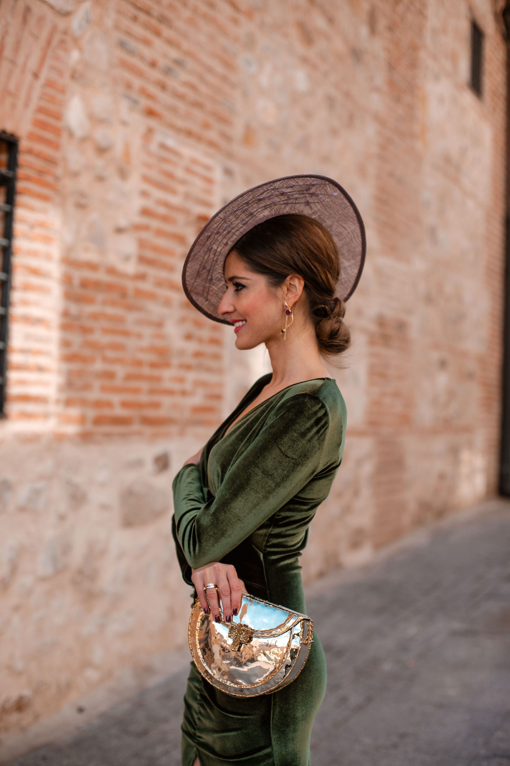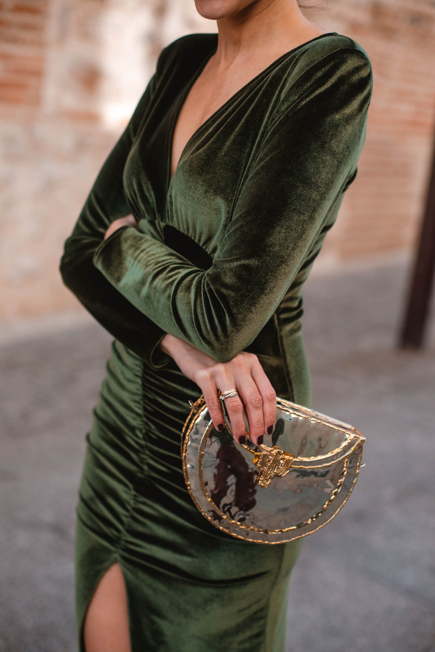 ¿Y qué nos decís de este otro conjunto? El terciopelo es, sin ninguna duda, el tejido estrella de esta temporada. Y este verde del vestido de Lola Li es perfecto para los eventos invernales. Para darle un toque festivo, Sandra lo combina con dorado, tanto en los pendientes como en nuestro bolso KuBell Cactus, el mejor candidato para poner un toque de originalidad. El cactus es un elemento que nos transporta directamente a México, por eso es un bolso icónico para nosotras. Lo mejor es que está disponible en varios modelos dependiendo de la forma del clutch. Además de este diseño podéis encontrarlo también redondo o alargado.