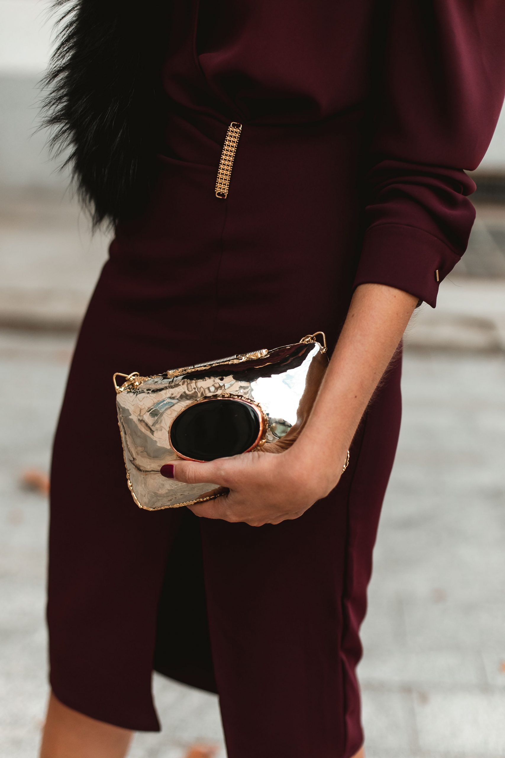 Como salida de una película antigua de Hollywood Sandra combinó este precioso vestido de Lola Li en color burdeos de corte midi con nuestro bolso Frida Ojo de Onix. Una pieza muy elegante con forma de almohadilla metálica y una piedra grande de Obsidiana de origen volcánico en la parte delantera. El bolso viene con una cadena dorada que se puede esconder si se prefiere llevar a modo de clutch.